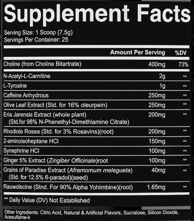 Mix 1 scoop (7.5g) with 8–10 oz of water and consume 20–30 minutes before training or cardio. Advanced users may also take it on non-training days to support ongoing fat-burning protocols.